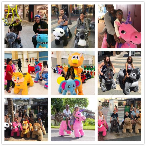 Hansel plush animal scooter are battery operated with coin or non coin type animals,it can walking in outdoor and indoor playground,we use fireproof plush with cotton inside for the animal skin,and structure material inside is mental steel frame which is very strong to bear a weight of 130kg.with its attractive appearance to consumers and fast profits to operator,more and more people are join this business,Will you join this business?